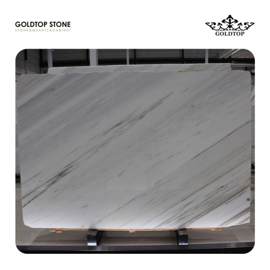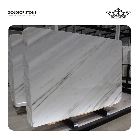 Dalles de marbre Cymophane Ce marbre, originaire de Chine, présente un fond d'un blanc pur élégamment veiné de brun profond. Sa surface est lisse et arbore un doux lustre rappelant le jade. Pierre polyvalente et durable, elle est idéale pour : le revêtement mural, les plans de travail de cuisine et les sols.