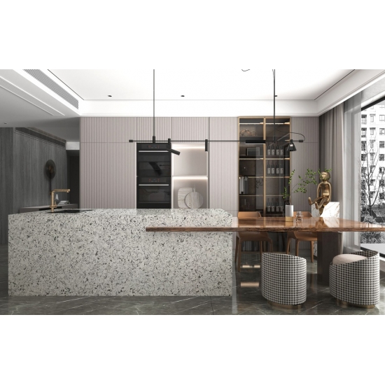 Le quartz Wing Soar Dark Sparkle est une pierre de quartz artificielle spécialement traitée qui se distingue des autres séries par son aspect plus scintillant. Ce quartz apporte profondeur et texture aux murs, sols, plans de travail, etc. Il permet de créer de superbes revêtements muraux et crédences de lavabo dans vos salles de bains et cuisines. Grâce à ses propriétés antibactériennes et à sa résistance à l'humidité, ce quartz est parfaitement adapté aux pièces humides.
