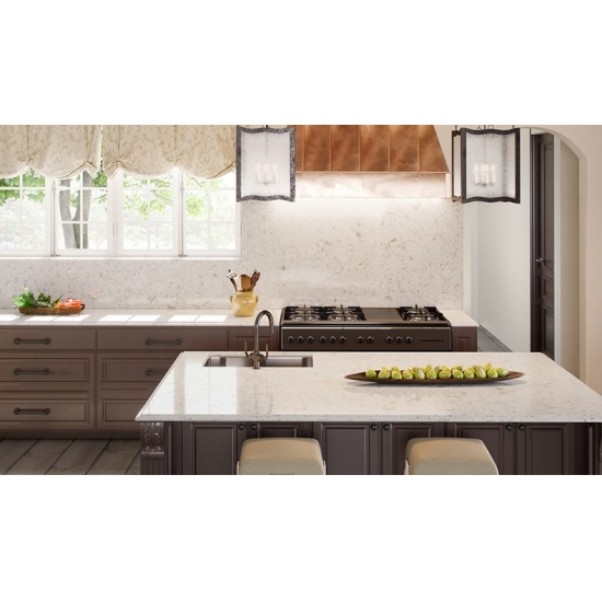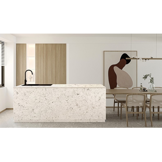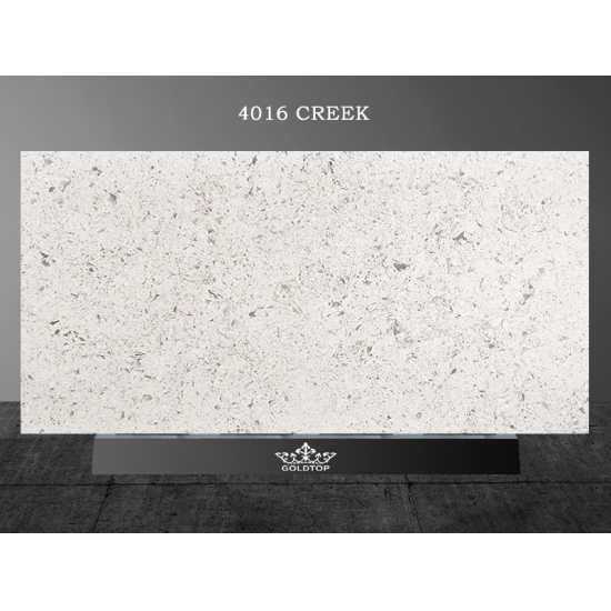 4016 Marbre et quartz Creek Ce quartz présente une apparence douce et élégante, avec un fond blanc crème délicatement veiné de motifs gris fluides. Ces veinures subtiles créent une impression naturelle de mouvement et de sophistication, conférant à la surface un charme raffiné et intemporel. Cette dalle est conçue pour apporter une touche de luxe discret à tout intérieur, sublimant les espaces par son esthétique sereine et gracieuse.