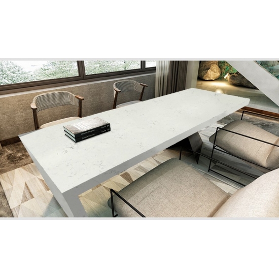 Dalle de quartz en marbre Bianco Carrara 4044 Ce quartz présente une apparence épurée et intemporelle, avec son fond blanc doux rehaussé de délicates veines grises fluides. Sa surface dégage une élégance discrète, tandis que les subtils motifs inspirés du marbre créent un aspect raffiné et harmonieux, ajoutant de la profondeur sans surcharger l'espace. Conçu pour offrir une esthétique classique, ce quartz apporte luminosité, équilibre et sophistication aux intérieurs résidentiels et commerciaux.