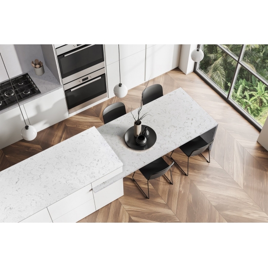 Le quartz Caesar 4051 Organic White Zero Silicon présente une surface d'un blanc pur et une composition écologique sans silicone, garantissant une utilisation sûre et non toxique. Ses atouts incluent une grande durabilité, un entretien facile et une esthétique minimaliste et moderne, ce qui en fait un matériau idéal pour les plans de travail de cuisine et de salle de bain dans les maisons soucieuses de leur santé.