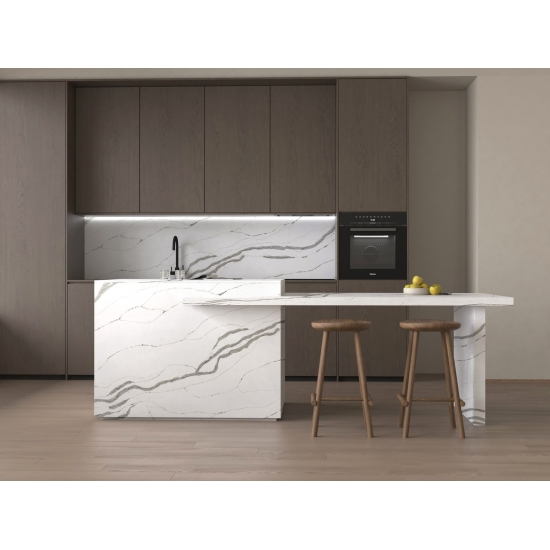 Ce quartz est idéal pour de nombreuses applications, des plans de travail et îlots de cuisine aux murs décoratifs et vasques. Son veinage marqué lui confère caractère et raffinement, en faisant un élément central de tout décor. Associé à des finitions métalliques élégantes ou à des tons boisés chaleureux, le quartz Calacatta Fiorina 5125 sublime l'élégance de tout espace.