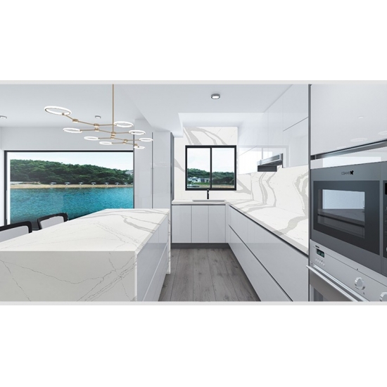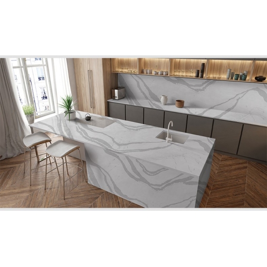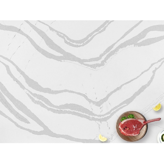 La dalle de quartz Valley 5014 présente un fond blanc crème doux, délicatement veiné de gris. Ce contraste subtil confère une élégance naturelle et une impression de mouvement serein. D'une beauté intemporelle et polyvalente, elle est idéale pour créer une atmosphère à la fois calme et sophistiquée dans tout intérieur.