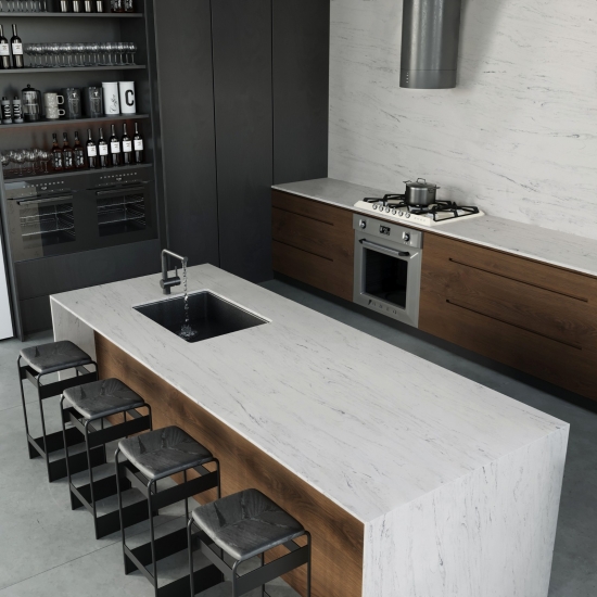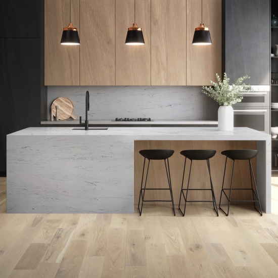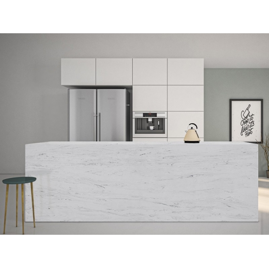 Raffiné et unique, le quartz Calacatta séduit par sa blancheur éclatante et son veinage traversant saisissant, évoquant le marbre. Son magnifique veinage large et sa texture luxueuse lui confèrent l'aspect naturel du marbre Calacatta, sans ses inconvénients. Extrêmement résistant aux taches et aux rayures, le quartz Calacatta est un choix idéal pour les plans de travail de cuisine et de salle de bain, les escaliers, les appuis de fenêtre, le mobilier sur mesure, les revêtements muraux et de sol intérieurs et extérieurs, les motifs découpés au jet d'eau et autres projets de design.