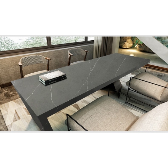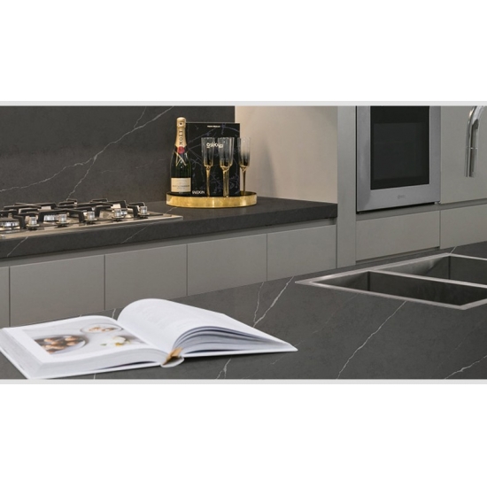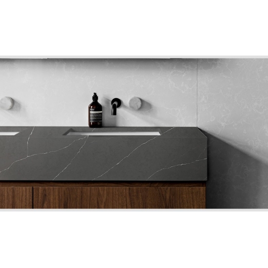La dalle de quartz 5032 Temper se distingue par son caractère audacieux et dynamique. Son fond anthracite profond est strié de veines blanches intenses. Ce motif à fort contraste crée une impression d'énergie saisissante et une touche de modernité. Offrant un impact visuel puissant, cette dalle est idéale pour les intérieurs contemporains et affirmés, apportant une sophistication spectaculaire à tout espace.