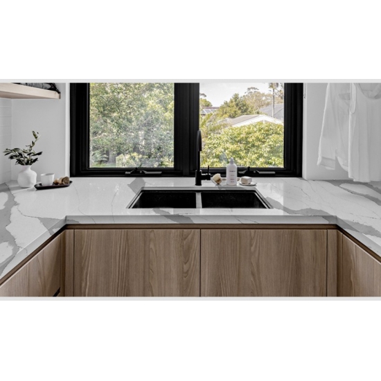 La dalle de quartz 5033 Ocean Wave présente un aspect dynamique et fluide, avec un fond bleu profond parcouru de veinures blanches audacieuses. Ce mouvement contrasté évoque la puissance et l'élégance des vagues de l'océan. Cette dalle crée un effet saisissant, idéale pour mettre en valeur un espace contemporain et insuffle à tout design une énergie vibrante et un luxe moderne.