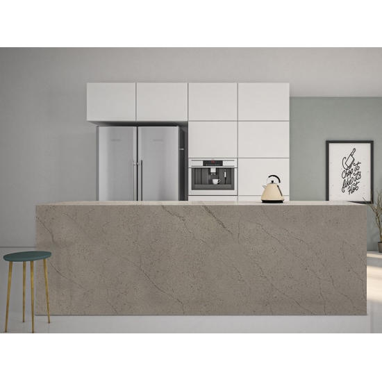 Le quartz Fior Bosco 5128 présente une élégante toile grise, finement veinée de motifs organiques qui évoquent la beauté sereine d'un paysage forestier. Chaque dalle offre une composition unique de nuances et de mouvements fluides, apportant une tranquillité moderne et apaisante à tout intérieur. Sa surface lumineuse amplifie la réflexion de la lumière, créant un jeu visuel dynamique, idéal pour les plans de travail de cuisine, les vasques de salle de bain et les murs d'accent.