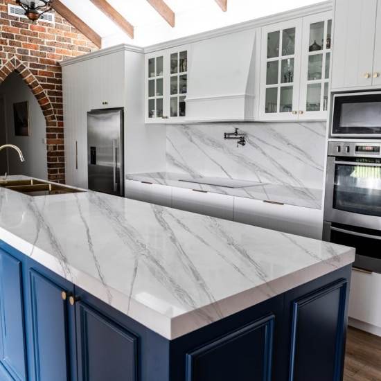 Le quartz Calacatta est actuellement le produit en pierre de quartz le plus populaire. Raffiné et unique, le quartz Calacatta séduit par sa blancheur éclatante et son veinage traversant imitant à la perfection le marbre. Avec son magnifique veinage large et sa texture luxueuse, ce quartz offre l'aspect naturel du marbre Calacatta, sans ses inconvénients. Très résistant aux taches et aux rayures, le quartz Calacatta est un choix idéal pour les plans de travail de cuisine et de salle de bain, les escaliers, les appuis de fenêtre, le mobilier sur mesure, les revêtements muraux et de sol intérieurs et extérieurs, les motifs découpés au jet d'eau et autres projets de design.