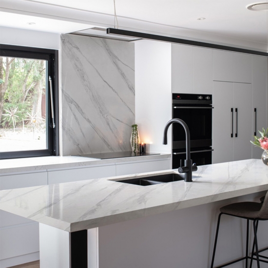 Raffiné et unique, le quartz Calacatta séduit par sa blancheur éclatante et son veinage traversant saisissant, évoquant le marbre. Son magnifique veinage large et sa texture luxueuse lui confèrent l'aspect naturel du marbre Calacatta, sans ses inconvénients. Extrêmement résistant aux taches et aux rayures, le quartz Calacatta est un choix idéal pour les plans de travail de cuisine et de salle de bain, les escaliers, les appuis de fenêtre, le mobilier sur mesure, les revêtements muraux et de sol intérieurs et extérieurs, les motifs découpés au jet d'eau et autres projets de design.