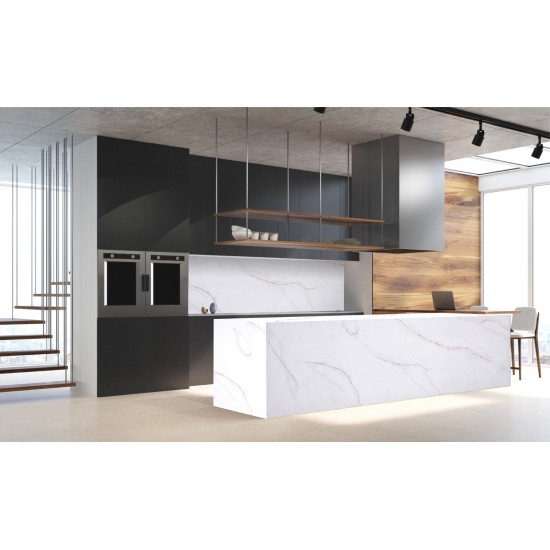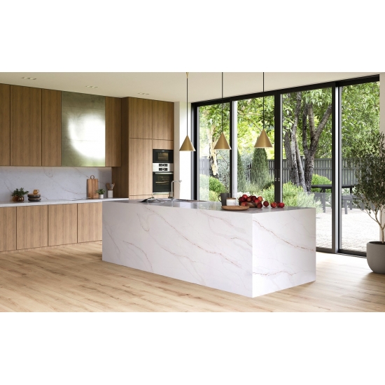 Le quartz Calacatta est composé de matériaux naturels, mais il est robuste, durable et peu poreux, ce qui rend les produits en pierre de quartz pratiquement inusables. Sa durabilité, son confort et l'homogénéité de ses motifs expliquent la popularité croissante de la pierre de quartz. Composé à 90 % de pierre naturelle, le reste est constitué de colle, de colorants et d'additifs qui améliorent ses propriétés techniques. Sa perméabilité à l'eau et sa résistance aux taches complètent sa beauté.