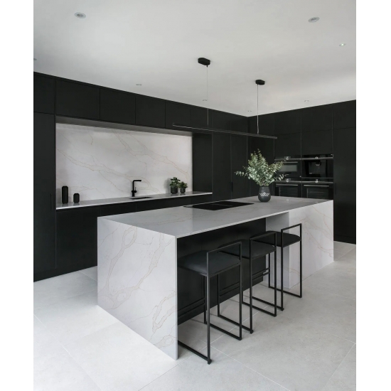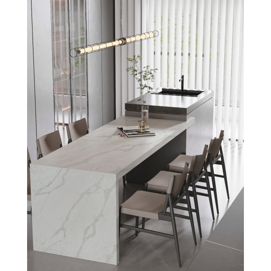 Le quartz Calacatta Verona 5063, sans silice, offre une solution plus saine et durable pour les surfaces, notamment dans les cuisines et les salles de bains. Sa composition sans silice facilite la pose et réduit les risques pour la santé liés à l'exposition à la poussière de silice. L'élégant veinage Calacatta lui confère un aspect luxueux semblable au marbre, tandis que sa surface résistante et non poreuse assure une excellente résistance aux taches, aux rayures et à la chaleur. C'est donc un choix idéal pour les zones à fort passage, alliant esthétique, sécurité et facilité d'entretien.