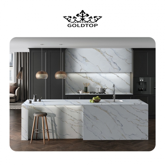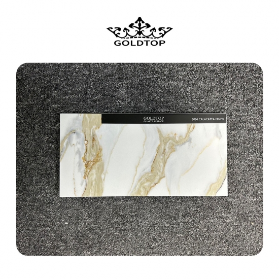 Les dalles de quartz Calacatta Fendy 5066 offrent une option élégante et raffinée pour de nombreuses surfaces. Elles se distinguent par un fond blanc éclatant rehaussé de veinures audacieuses et spectaculaires dans des tons de gris et d'or. Ce veinage imite l'aspect classique du marbre Calacatta naturel, tout en bénéficiant de la durabilité et de la facilité d'entretien du quartz.