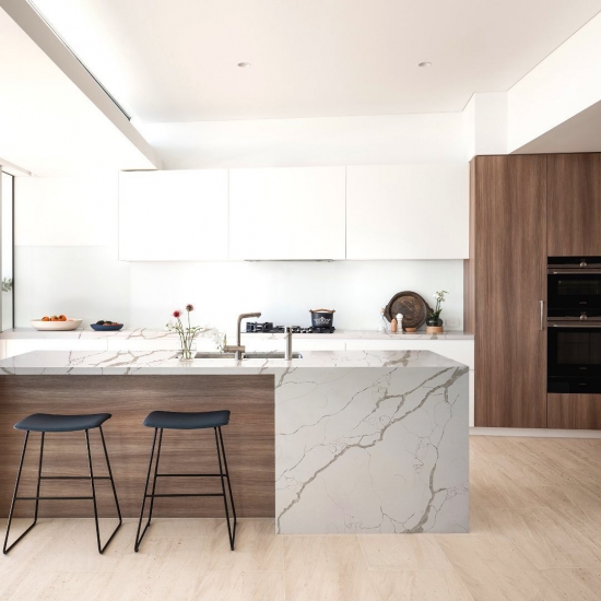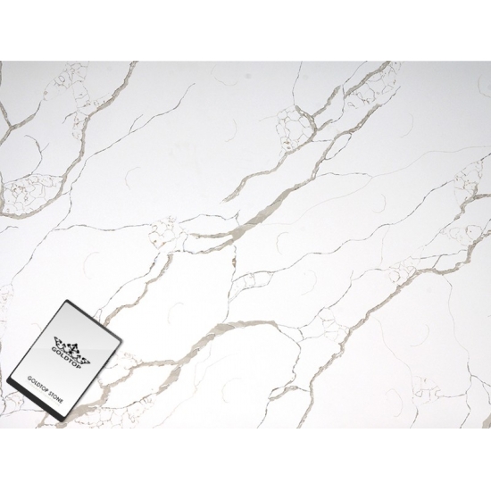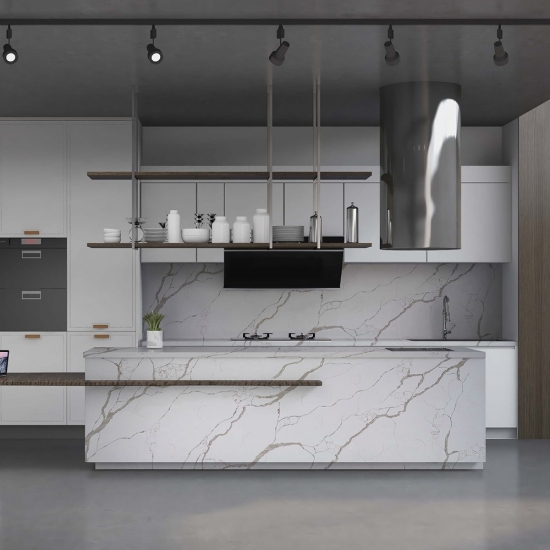 Le quartz Calacatta est actuellement le produit en pierre de quartz le plus populaire. Raffiné et unique, le quartz Calacatta séduit par sa blancheur éclatante et son veinage traversant imitant à la perfection le marbre. Avec son magnifique veinage large et sa texture luxueuse, ce quartz offre l'aspect naturel du marbre Calacatta, sans ses inconvénients. Très résistant aux taches et aux rayures, le quartz Calacatta est un choix idéal pour les plans de travail de cuisine et de salle de bain, les escaliers, les appuis de fenêtre, le mobilier sur mesure, les revêtements muraux et de sol intérieurs et extérieurs, les motifs découpés au jet d'eau et autres projets de design.