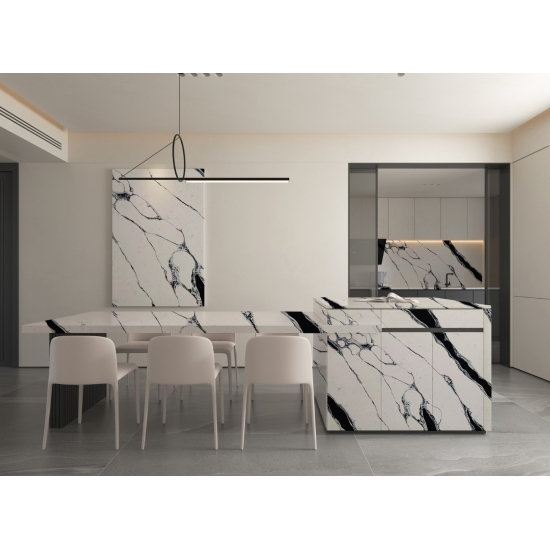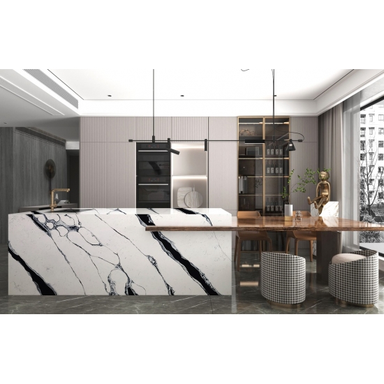 Le quartz Volakas White Calacatta 5044 se prête à de nombreuses applications grâce à son élégance intemporelle et à son design polyvalent. Ce quartz poli est couramment utilisé pour les plans de travail de cuisine, les vasques de salle de bain et les crédences, où sa surface blanche immaculée, légèrement veinée de gris, apporte une touche de raffinement. Il est également idéal pour les revêtements muraux et les sols, aussi bien dans les espaces résidentiels que commerciaux.