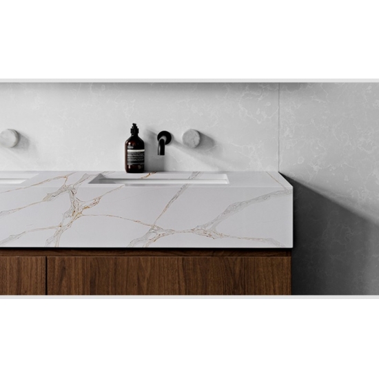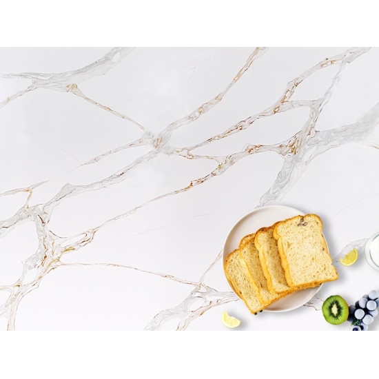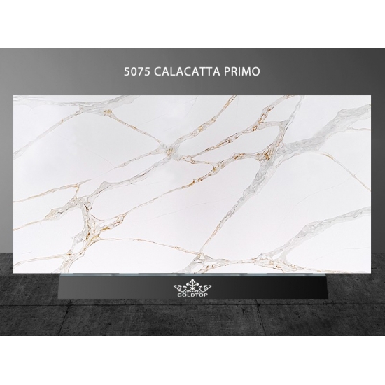 La dalle de quartz Calacatta Primo 5075 présente un blanc éclatant rehaussé de veinures audacieuses et spectaculaires dans des nuances de gris. Ce contraste saisissant crée un impact visuel puissant et luxueux. Incarnant l'opulence moderne, cette dalle est une pièce maîtresse idéale pour les cuisines et salles de bains contemporaines, sublimant instantanément l'espace par son élégance affirmée.