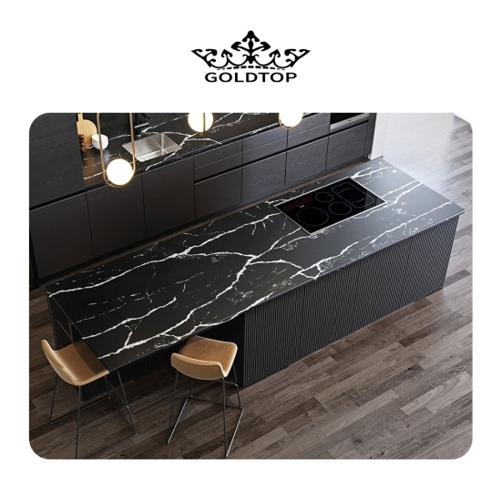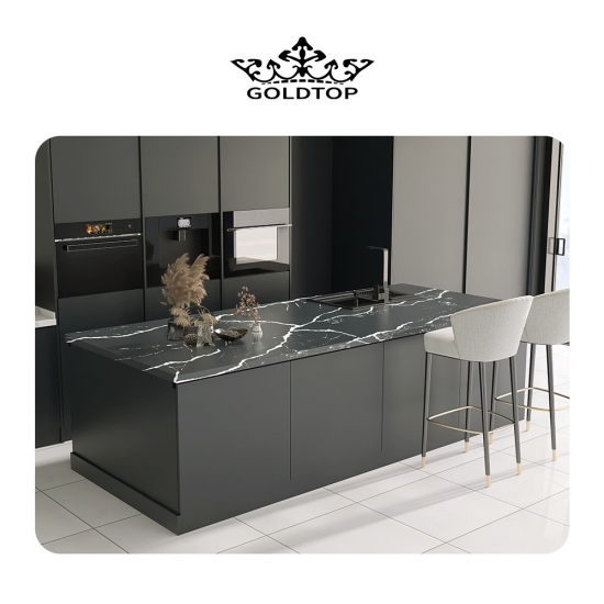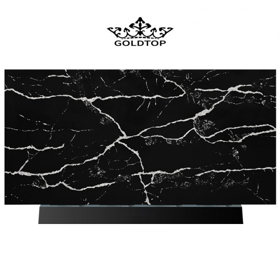Le plan de travail en quartz noir Calacatta Nero 5090 veiné de blanc est un matériau de synthèse haut de gamme. Sa couleur noire, plus luxueuse, s'harmonise avec différents styles de décoration.