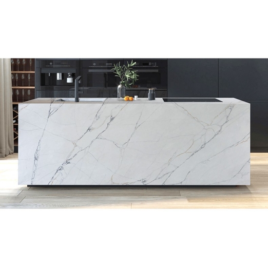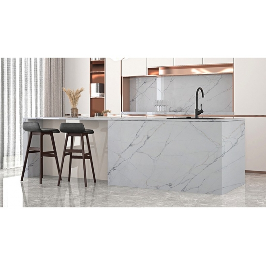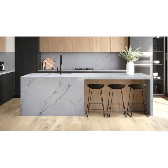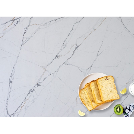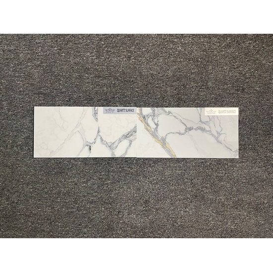 50 Square MetersRaffiné et unique, le quartz Calacatta séduit par sa blancheur éclatante et son veinage traversant saisissant, évoquant le marbre. Son magnifique veinage large et sa texture luxueuse lui confèrent l'aspect naturel du marbre Calacatta, sans ses inconvénients. Extrêmement résistant aux taches et aux rayures, le quartz Calacatta est un choix idéal pour les plans de travail de cuisine et de salle de bain, les escaliers, les appuis de fenêtre, le mobilier sur mesure, les revêtements muraux et de sol intérieurs et extérieurs, les motifs découpés au jet d'eau et autres projets de design.