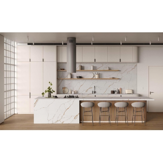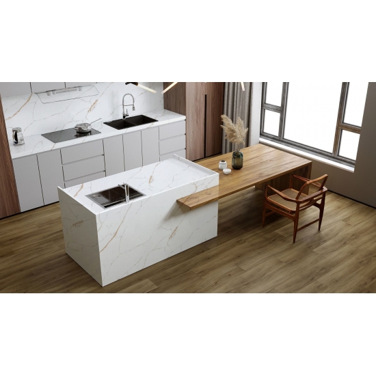 Le quartz Calacatta est actuellement le produit en pierre de quartz le plus populaire. Raffiné et unique, le quartz Calacatta séduit par sa blancheur éclatante et son veinage traversant imitant à la perfection le marbre. Avec son magnifique veinage large et sa texture luxueuse, ce quartz offre l'aspect naturel du marbre Calacatta, sans ses inconvénients. Très résistant aux taches et aux rayures, le quartz Calacatta est un choix idéal pour les plans de travail de cuisine et de salle de bain, les escaliers, les appuis de fenêtre, le mobilier sur mesure, les revêtements muraux et de sol intérieurs et extérieurs, les motifs découpés au jet d'eau et autres projets de design.