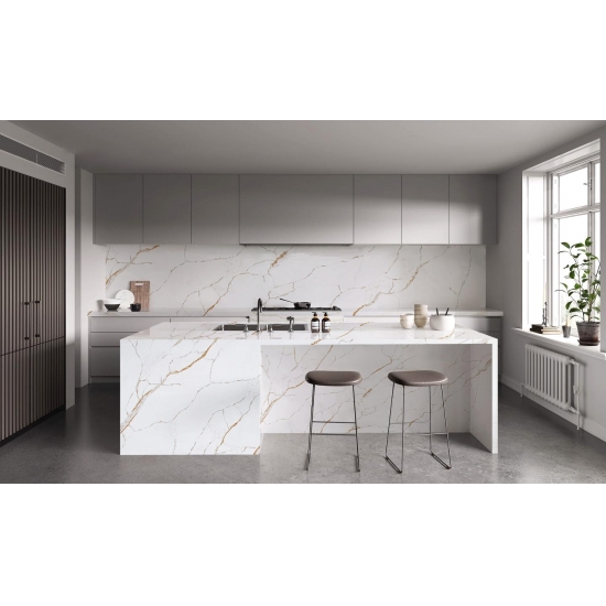 Raffiné et unique, le quartz Calacatta séduit par sa blancheur éclatante et son veinage traversant saisissant, évoquant le marbre. Son magnifique veinage large et sa texture luxueuse lui confèrent l'aspect naturel du marbre Calacatta, sans ses inconvénients. Extrêmement résistant aux taches et aux rayures, le quartz Calacatta est un choix idéal pour les plans de travail de cuisine et de salle de bain, les escaliers, les appuis de fenêtre, le mobilier sur mesure, les revêtements muraux et de sol intérieurs et extérieurs, les motifs découpés au jet d'eau et autres projets de design.