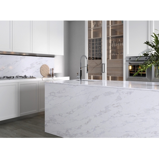 Le quartz Calacatta est actuellement le produit en pierre de quartz le plus populaire. Raffiné et unique, le quartz Calacatta séduit par sa blancheur éclatante et son veinage traversant imitant à la perfection le marbre. Avec son magnifique veinage large et sa texture luxueuse, ce quartz offre l'aspect naturel du marbre Calacatta, sans ses inconvénients. Très résistant aux taches et aux rayures, le quartz Calacatta est un choix idéal pour les plans de travail de cuisine et de salle de bain, les escaliers, les appuis de fenêtre, le mobilier sur mesure, les revêtements muraux et de sol intérieurs et extérieurs, les motifs découpés au jet d'eau et autres projets de design.