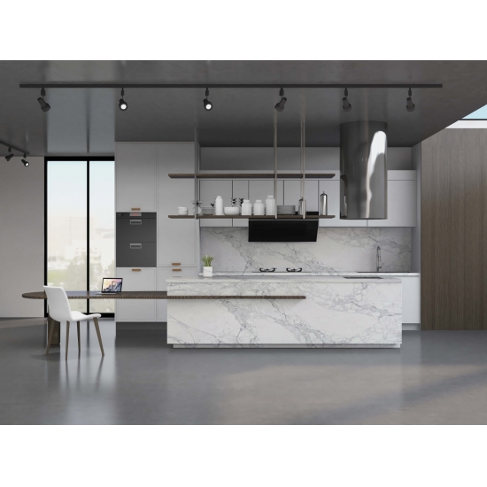 Le quartz Calacatta est actuellement le produit en pierre de quartz le plus populaire. Raffiné et unique, le quartz Calacatta séduit par sa blancheur éclatante et son veinage traversant imitant à la perfection le marbre. Avec son magnifique veinage large et sa texture luxueuse, ce quartz offre l'aspect naturel du marbre Calacatta, sans ses inconvénients. Très résistant aux taches et aux rayures, le quartz Calacatta est un choix idéal pour les plans de travail de cuisine et de salle de bain, les escaliers, les appuis de fenêtre, le mobilier sur mesure, les revêtements muraux et de sol intérieurs et extérieurs, les motifs découpés au jet d'eau et autres projets de design.