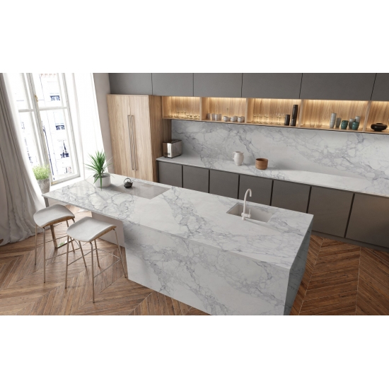 Raffiné et unique, le quartz Calacatta séduit par sa blancheur éclatante et son veinage traversant saisissant, évoquant le marbre. Son magnifique veinage large et sa texture luxueuse lui confèrent l'aspect naturel du marbre Calacatta, sans ses inconvénients. Extrêmement résistant aux taches et aux rayures, le quartz Calacatta est un choix idéal pour les plans de travail de cuisine et de salle de bain, les escaliers, les appuis de fenêtre, le mobilier sur mesure, les revêtements muraux et de sol intérieurs et extérieurs, les motifs découpés au jet d'eau et autres projets de design.
