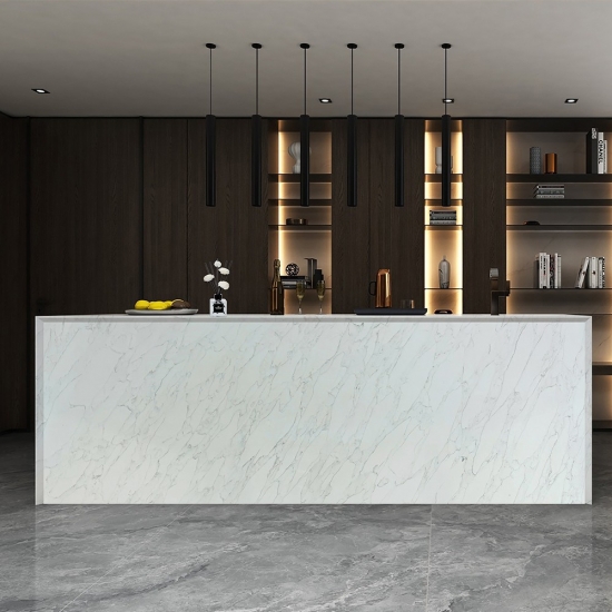 Le quartz Calacatta est actuellement le produit en pierre de quartz le plus populaire. Raffiné et unique, le quartz Calacatta séduit par sa blancheur éclatante et son veinage traversant imitant à la perfection le marbre. Avec son magnifique veinage large et sa texture luxueuse, ce quartz offre l'aspect naturel du marbre Calacatta, sans ses inconvénients. Très résistant aux taches et aux rayures, le quartz Calacatta est un choix idéal pour les plans de travail de cuisine et de salle de bain, les escaliers, les appuis de fenêtre, le mobilier sur mesure, les revêtements muraux et de sol intérieurs et extérieurs, les motifs découpés au jet d'eau et autres projets de design.