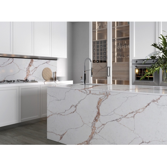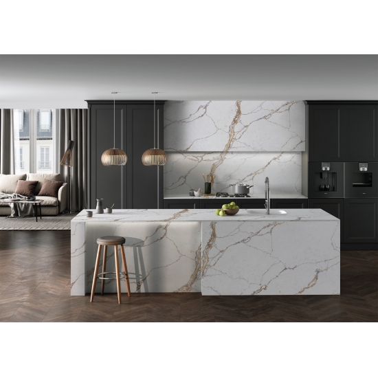 Le quartz Calacatta est actuellement le produit en pierre de quartz le plus populaire. Raffiné et unique, le quartz Calacatta séduit par sa blancheur éclatante et son veinage traversant imitant à la perfection le marbre. Avec son magnifique veinage large et sa texture luxueuse, ce quartz offre l'aspect naturel du marbre Calacatta, sans ses inconvénients. Très résistant aux taches et aux rayures, le quartz Calacatta est un choix idéal pour les plans de travail de cuisine et de salle de bain, les escaliers, les appuis de fenêtre, le mobilier sur mesure, les revêtements muraux et de sol intérieurs et extérieurs, les motifs découpés au jet d'eau et autres projets de design.