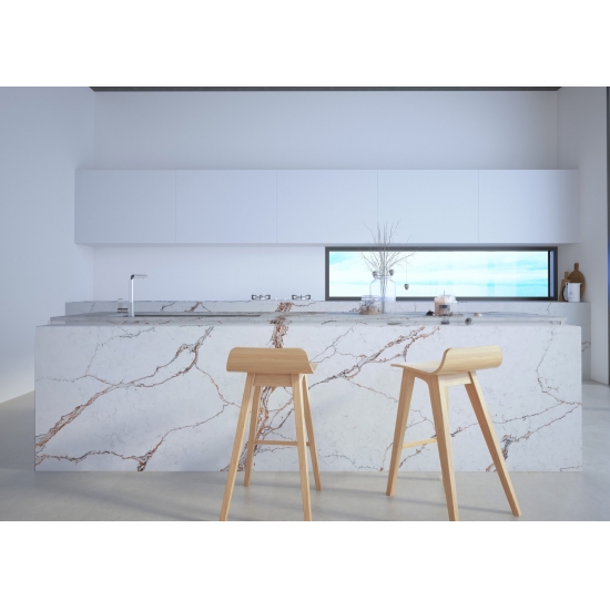Raffiné et unique, le quartz Calacatta séduit par sa blancheur éclatante et son veinage traversant saisissant, évoquant le marbre. Son magnifique veinage large et sa texture luxueuse lui confèrent l'aspect naturel du marbre Calacatta, sans ses inconvénients. Extrêmement résistant aux taches et aux rayures, le quartz Calacatta est un choix idéal pour les plans de travail de cuisine et de salle de bain, les escaliers, les appuis de fenêtre, le mobilier sur mesure, les revêtements muraux et de sol intérieurs et extérieurs, les motifs découpés au jet d'eau et autres projets de design.