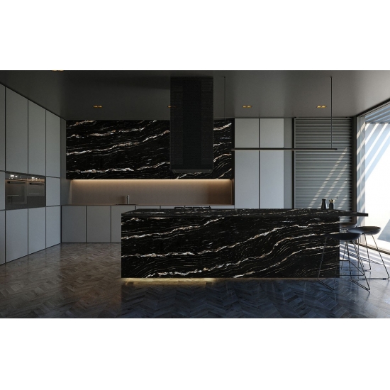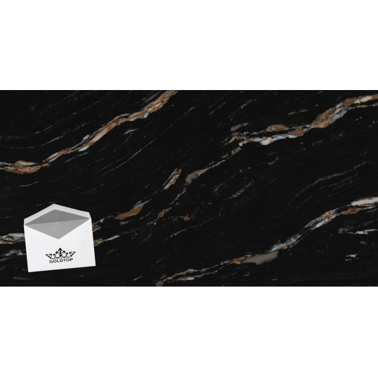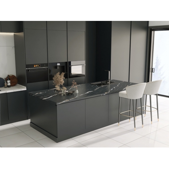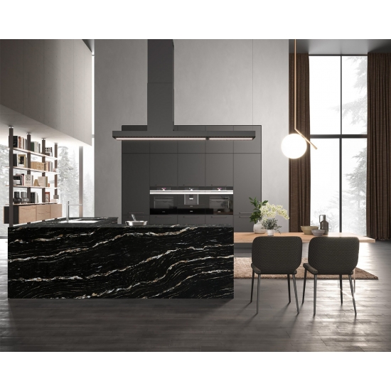 Le quartz Milan Extra Calacatta Gold 5121 se distingue par son aspect audacieux et spectaculaire. Son fond noir profond est parsemé de fines particules scintillantes. La surface, d'une grande sophistication, contraste avec les subtiles mouchetures qui captent la lumière, créant ainsi une impression de profondeur et de mouvement. Ce quartz est conçu pour affirmer son style et apporter une touche d'opulence à tout espace qu'il orne.
