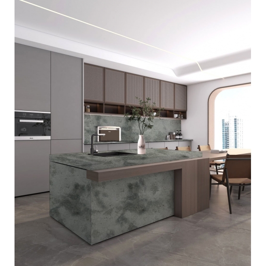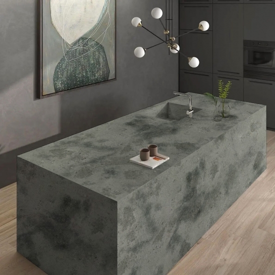 Le quartz béton est une pierre artificielle en quartz ayant subi un traitement spécifique. Proche d'une finition mate, la finition béton modifie légèrement la couleur du quartz par rapport à une finition polie classique. Cette finition est également appelée « brossée » pour le granit.