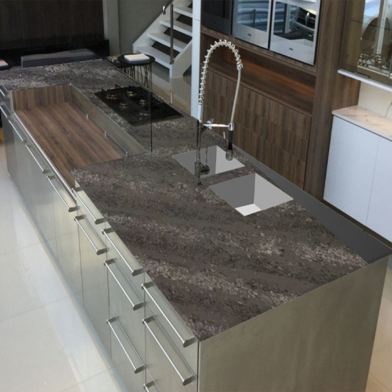 Le quartz béton est une pierre artificielle en quartz ayant subi un traitement spécifique. Proche d'une finition mate, la finition béton modifie légèrement la couleur du quartz par rapport à une finition polie classique. Cette finition est également appelée « brossée » pour le granit.