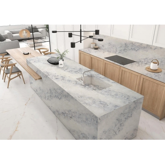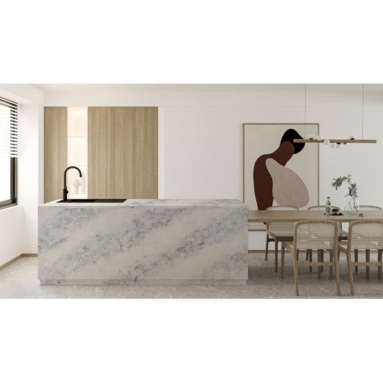 Le quartz blanc ciment à texture flocon de neige est un matériau de pierre artificielle spécialement traité. Son aspect, proche d'une finition mate, lui confère une couleur légèrement différente de celle d'une finition polie classique. Cette finition est également qualifiée de « brossée » pour le granit.