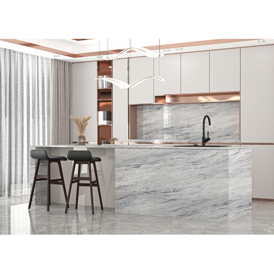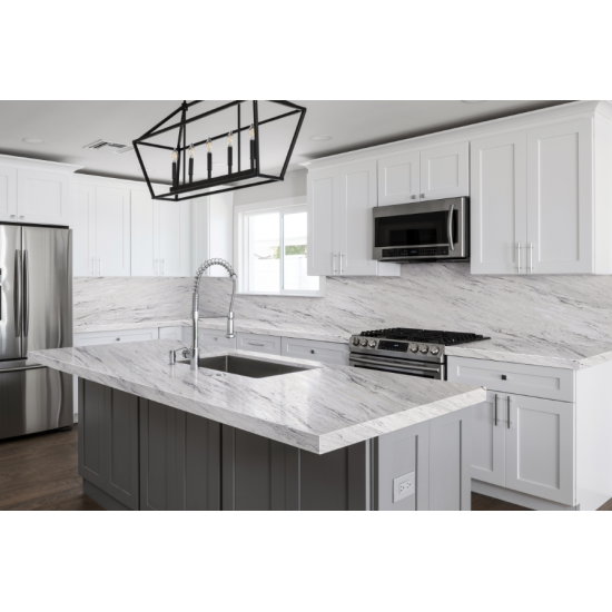 Le quartz blanc ciment à texture flocon de neige est un matériau de pierre artificielle spécialement traité. Son aspect, proche d'une finition mate, lui confère une couleur légèrement différente de celle d'une finition polie classique. Cette finition est également qualifiée de « brossée » pour le granit.