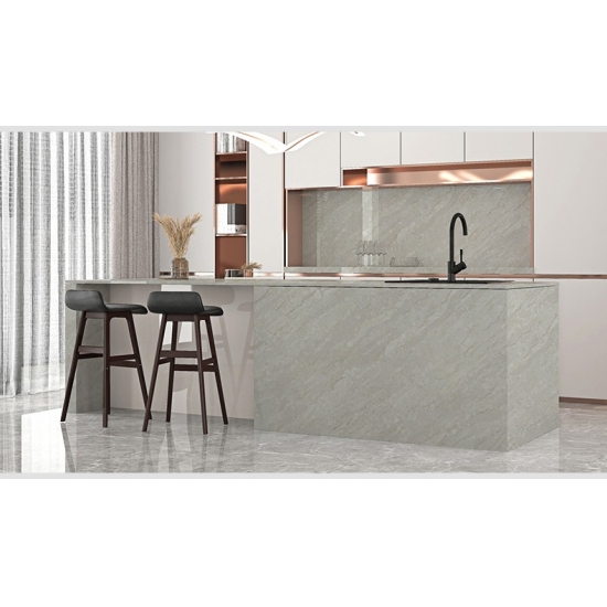 6004 Horizon Gris QUARTZ EN BÉTON Le quartz béton est une pierre artificielle en quartz ayant subi un traitement spécifique. Proche d'une finition mate, la finition béton modifie légèrement la couleur du quartz par rapport à une finition polie classique. Cette finition est également appelée « brossée » pour le granit.
