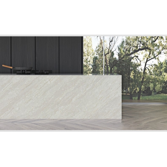 Le quartz blanc ciment à texture flocon de neige est un matériau de pierre artificielle spécialement traité. Son aspect, proche d'une finition mate, lui confère une couleur légèrement différente de celle d'une finition polie classique. Cette finition est également qualifiée de « brossée » pour le granit.