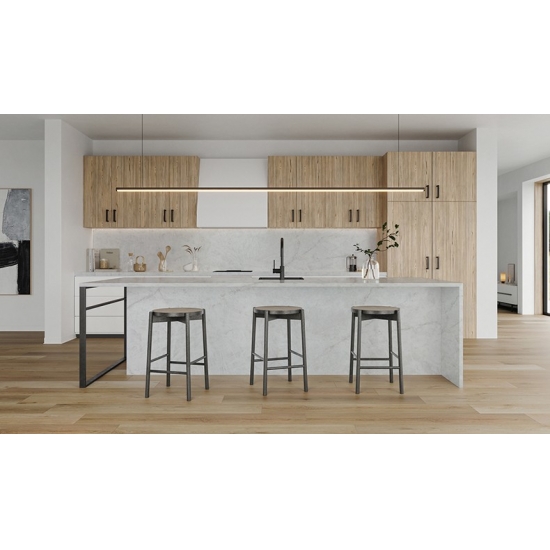Cristallo Printed Quartz est une pierre reconstituée inspirée du quartzite naturel rare, reproduisant avec une précision méticuleuse la beauté emblématique du quartzite Cristallo. Son fond blanc glacé lumineux est orné de délicates veines grises et de vibrantes paillettes cristallines orange, créant une douce lueur translucide sous la lumière pour une ambiance éthérée et luxueuse.