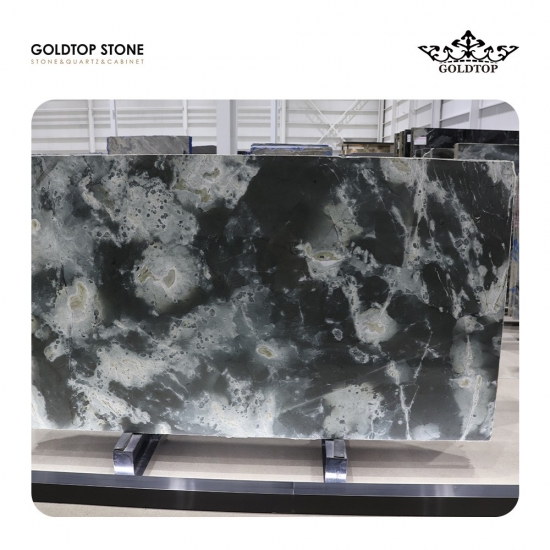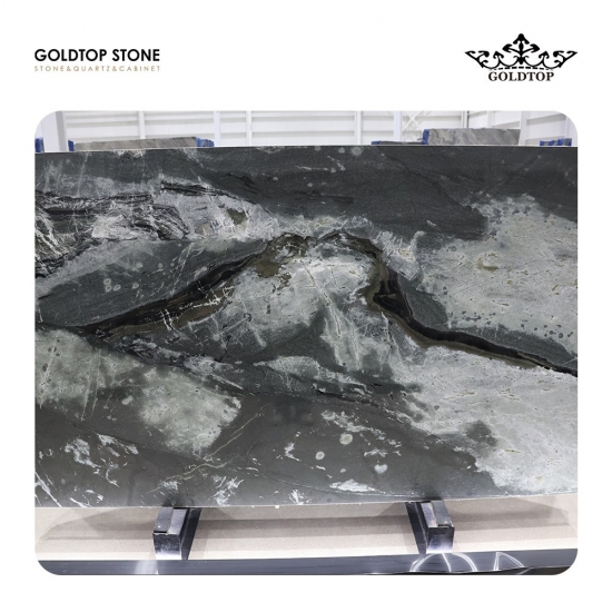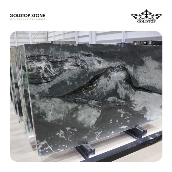 Quartzite Calactic Starlight du Brésil Cette pierre naturelle captivante du Brésil est réputée pour son fond noir profond orné de volutes vertes et blanches envoûtantes. Son motif complexe évoque une galaxie paisible parsemée de nébuleuses vibrantes, offrant une esthétique véritablement cosmique.
