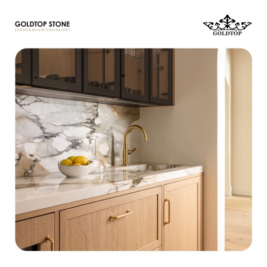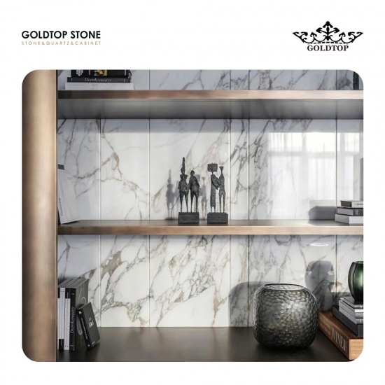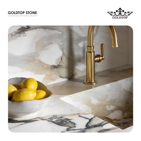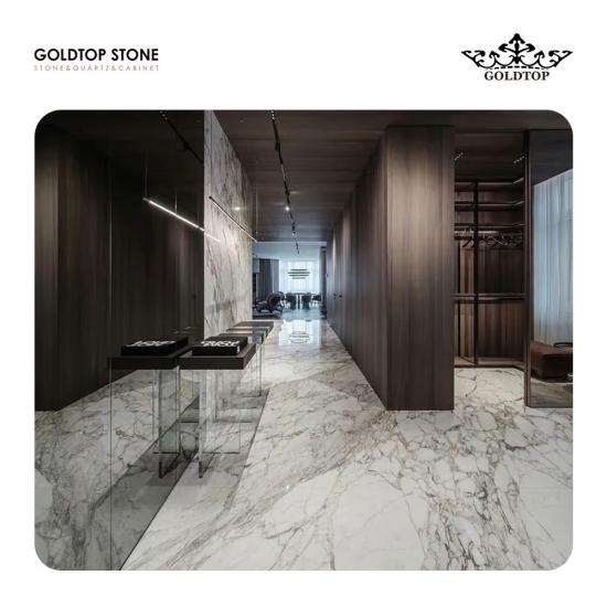 Polished,Honed,Flamed,LeatherLe poli de 3/4" (2 cm) Calacatta Macchia Vecchia Marbre S laboratoire Elle capte et reflète la lumière, mettant en valeur avec éclat les veinures complexes et les couleurs riches du Calacatta Macchia Vecchia. Elle est ainsi idéale pour les plans de travail d'exception, les murs décoratifs et autres aménagements intérieurs luxueux.