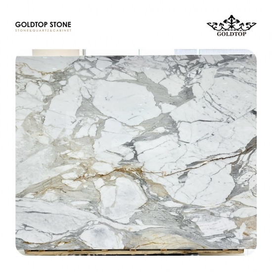 Marbre Calacatta Macchia Vecchia Elle présente un élégant fond blanc crème, animé par de larges veines aux teintes douces de gris, d'or et d'ocre. Son motif bréchique distinctif crée une puissante impression de mouvement, révélant un caractère visuel dynamique et complexe.